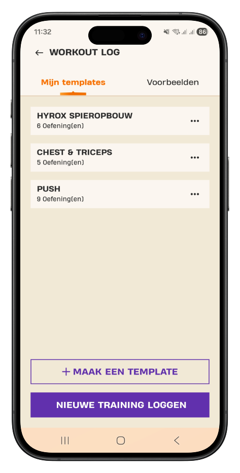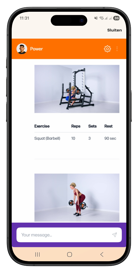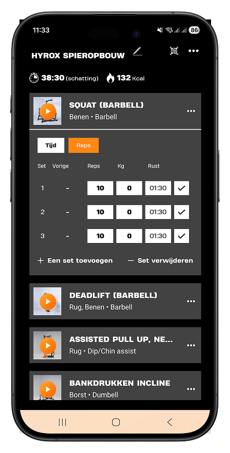 Je Fitbuddy geeft je de oefeningen, sets, herhalingen en rusttijd.