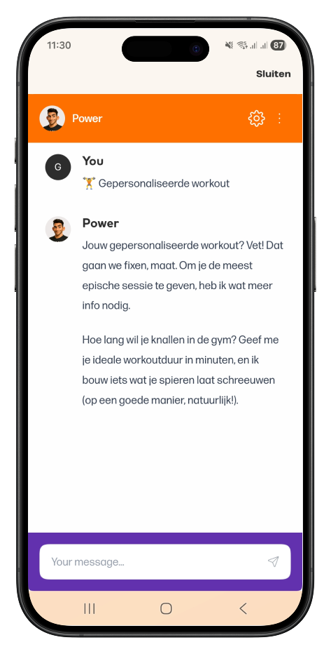 Power is je resultaatgerichte coach met een heldere focus. Hij is er om harder te trainen, scherp te blijven en alles uit je workout te halen. Hij brengt structuur, intensiteit en motivatie die elke set laat tellen.