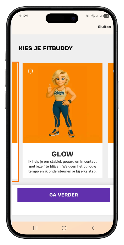 Glow is je rustige, stabiele coach die je helpt kracht op te bouwen met aandacht en consistentie. Ze helpt je om bewust te bewegen en in contact te blijven met je lichaam. Perfect als je support zoekt die jou volgt in jouw tempo.